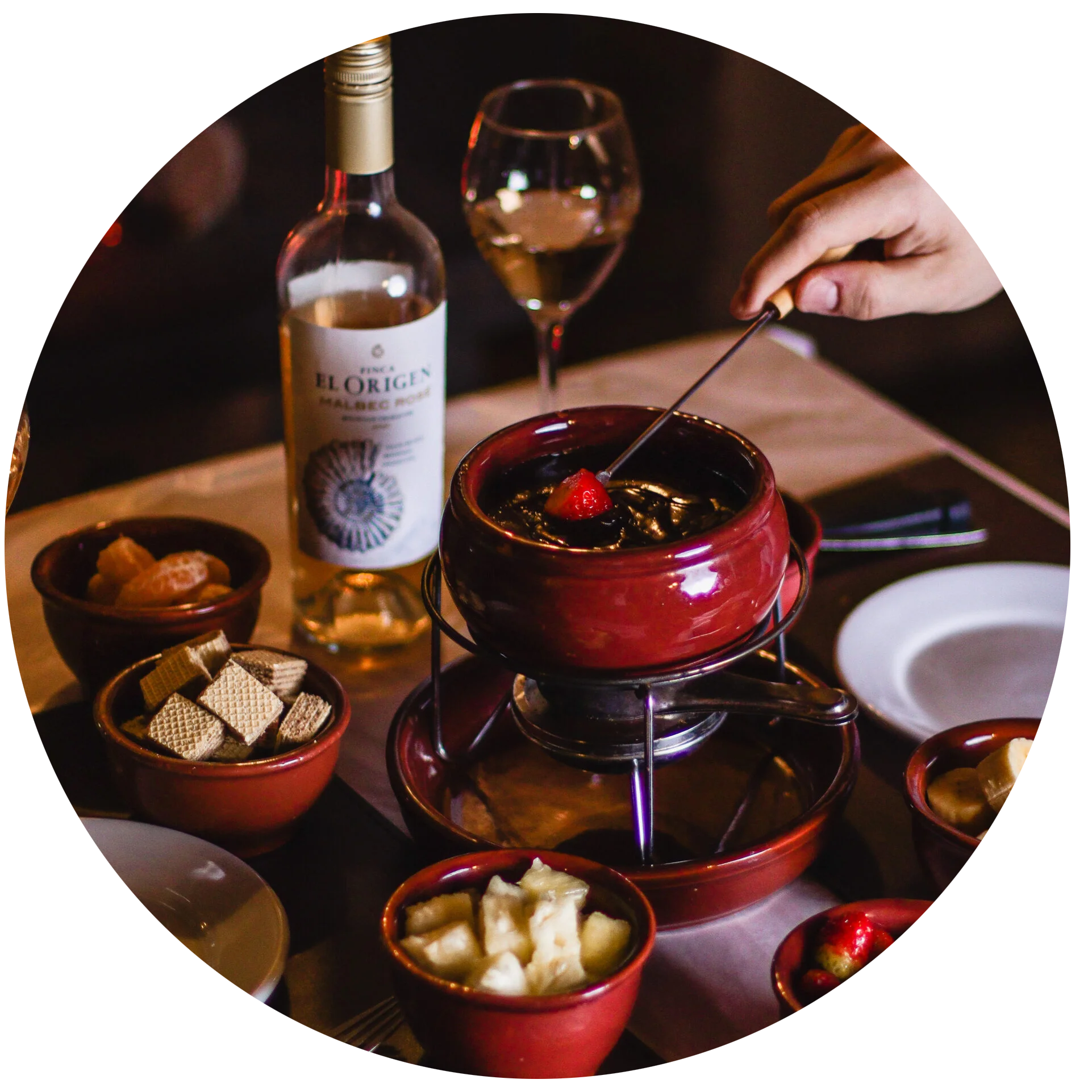 O jantar dá direito ao fondue de queijo, carnes e doce.